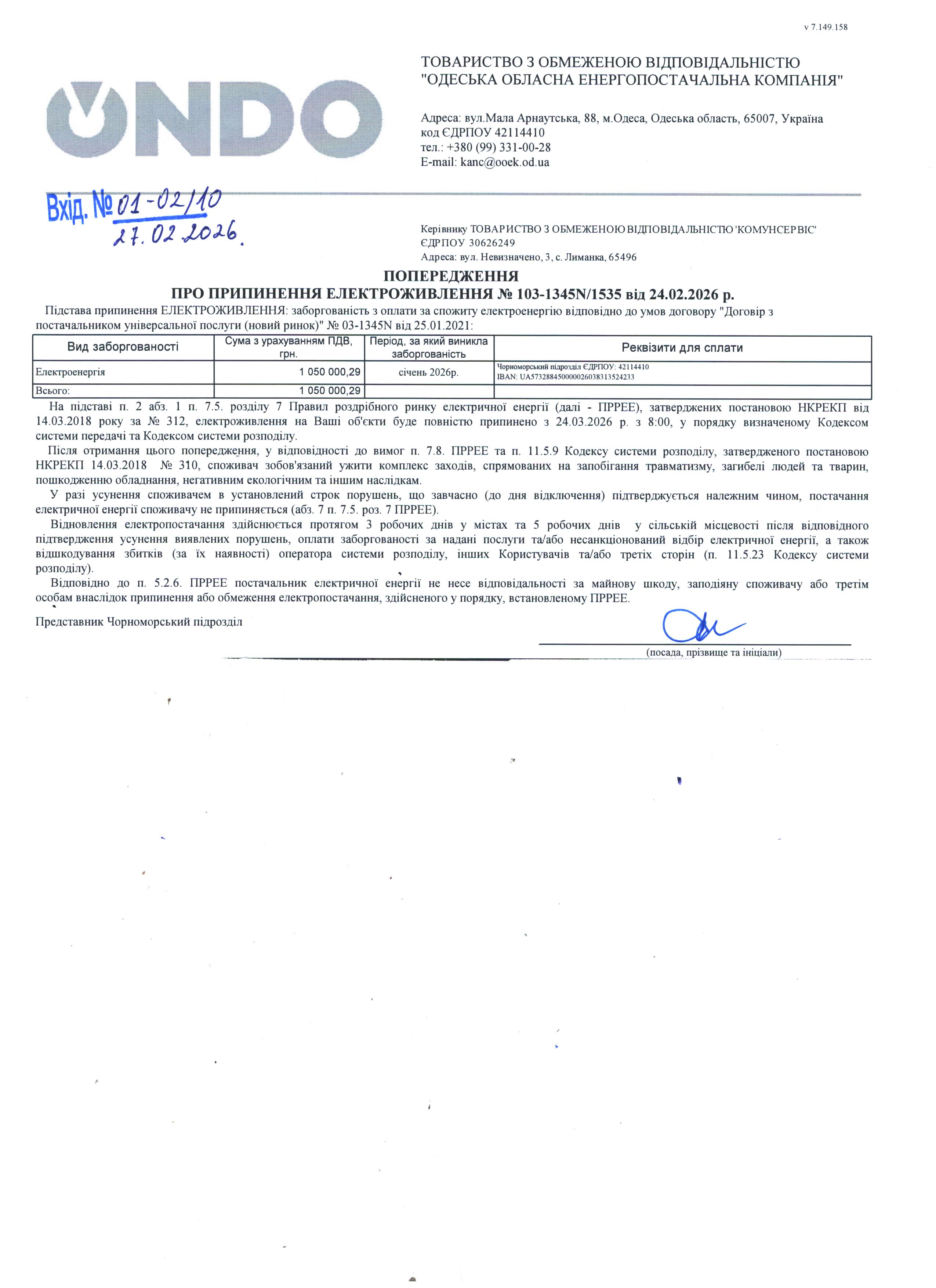 На адресу ТОВ «КОМУНСЕРІВС» від ТОВ «ООЕК» надійшов лист № 103-1345N/1535 від 24.02.2026 у вигляді попередження про припинення електроживлення у зв'язку з наявною заборгованістю за спожиту електроенергіюна на суму 1 050 000,29 грн.